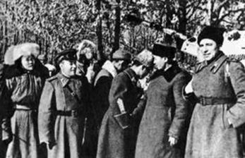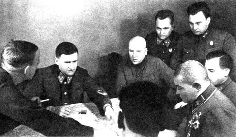 В штабе Западного фронта. Второй слева – командующий фронтом В. Д. Соколовский, справа (на переднем плане) – маршал Х. Чойбалсан. Январь 1943 г.