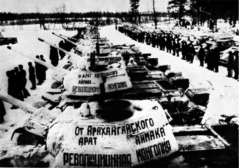 Момент передачи танковой колонны. Помимо надписи «Революционная Монголия», на каждом танке сделаны надписи от какого аймака МНР он дарствуется