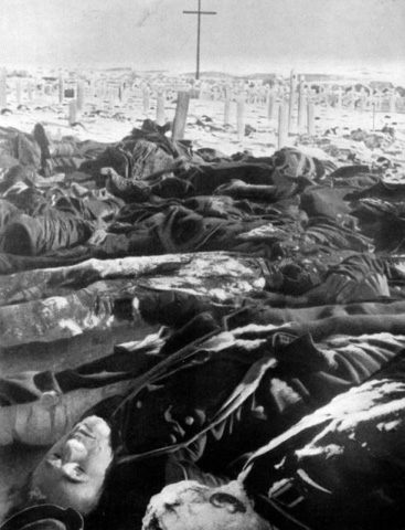 Тела погибших в районе Сталинграда немецких солдат. На заднем плане – немецкое военное кладбище, январь 1943 г.