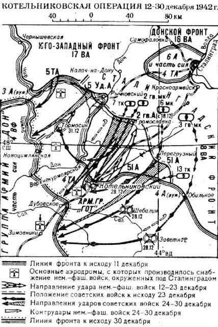 12 декабря 1942 г. гитлеровцы переходят в наступление из района Котельниково на Сталинград с целью выведения из окружения 6-й армии Фридриха Паулюса. Началась операция «Зимняя гроза». Планирование и проведение операции возложено на группу армий «Дон» под командованием Эриха фон Манштейна. Используя огромное превосходство в силах, противник сламывает сопротивление ослабленных в ходе ноябрьской операции дивизий 51-й армии и продвигается на север (к. 5).