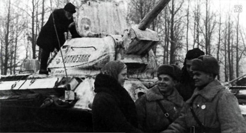 В эти же дни. В середине декабря 1942 г. делегация тамбовских колхозников передает в торжественной обстановке танки Красной Армии. На заснеженном поле выстраиваются в два ряда могучие машины. На каждой из них четко выделяется надпись: «Тамбовский колхозник». Делегаты, внимательно, по-хозяйски осмотрев танки, вручают их экипажам, состоящим из гвардейцев-защитников Сталинграда. Одновременно они передают танкистам подарки, обмениваются адресами. Обращаясь к воинам, колхозники призывают их смело вести грозные машины вперед, мстить за кровь и страдания советских людей. «Пусть хранит вас, – пишут они в своем обращении, – несокрушимая броня наших танков и наша горячая всенародная любовь».