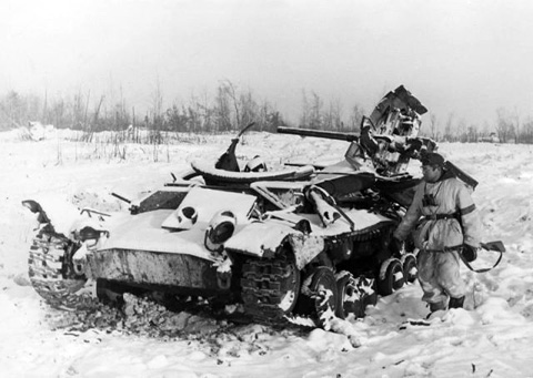 Немецкий солдат осматривает уничтоженный советский танк английского производства «Валентайн»