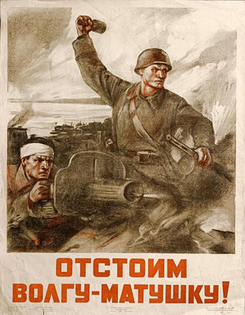 Представь бойца, идущего в колонне по пыльной дороге к Волге. Он устал, от пыли и пота слипаются глаза, на плече бронебойное ружье или ручной пулемет, на поясе подсумок с патронами и гранаты, за спиной вещевой мешок с провиантом и вещичками, которые положила ему жена или мать в дальнюю дорогу. К тому же где-то там, далеко, в родном селе, он оставил старушку-мать, жену, детей. Он думает о них и надеется вернуться к ним. Но вот он подходит к Волге и видит багровое от пожаров небо, ему уже слышен гром взрывов и снова мысли о доме, о жене, о детях. Только теперь он думает о них по-иному: «Как они будут жить без меня?». И не напомни ему в эту минуту о смертельной опасности, нависшей над Родиной, о священном долге перед Отечеством, он под тяжестью своих дум остановится или замедлит шаг. Но он идет, не останавливается, по обочинам дороги плакаты, лозунги, они зовут его вперед пламенными словами: