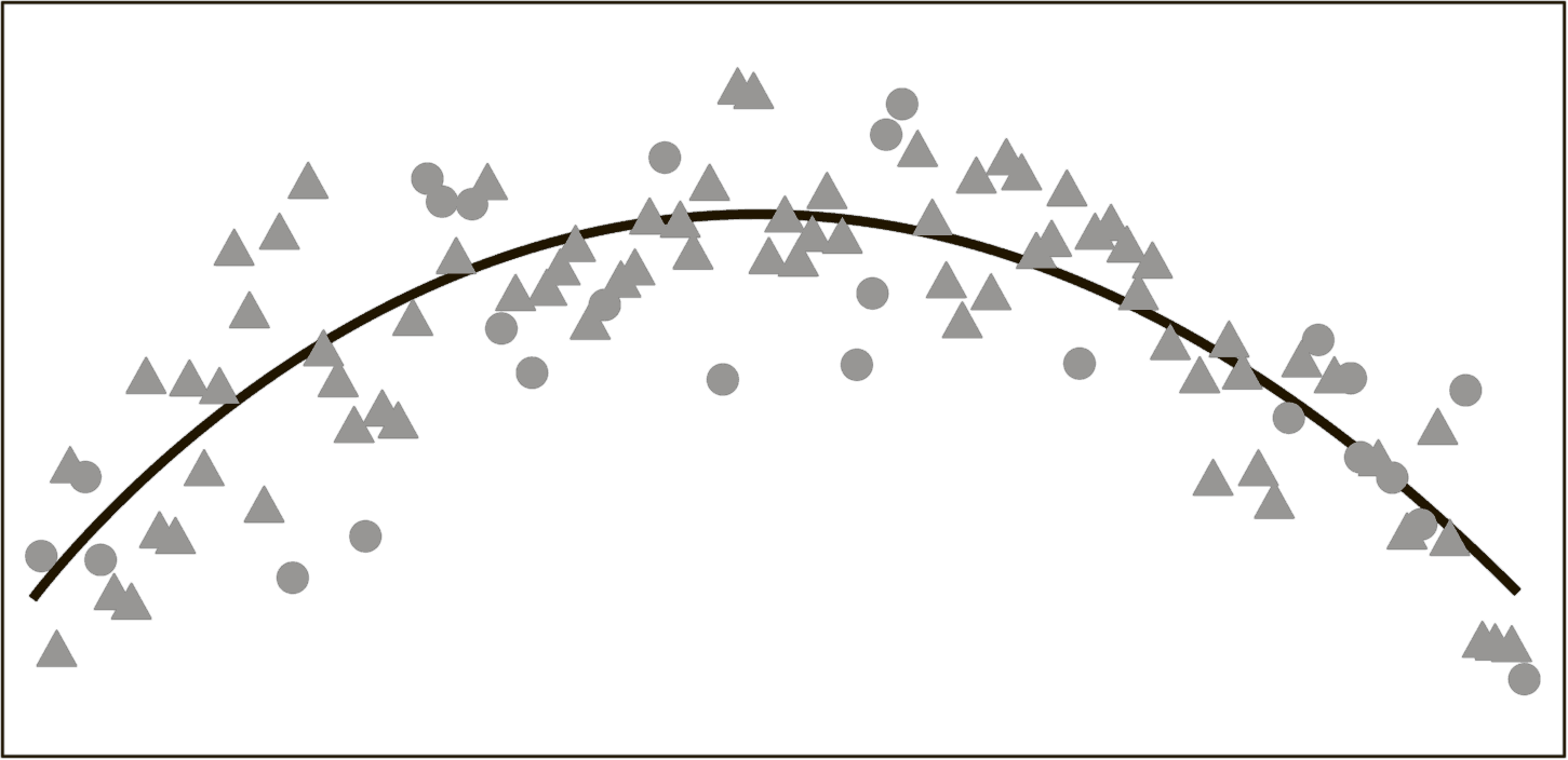 На график я нанес 100 точек данных, представленных в виде кругов и треугольников. Этого должно быть достаточно для выявления сигнала даже с учетом шума. Хотя в данных и присутствует некая доля случайности, вполне понятно, что они в целом следуют нашей кривой.