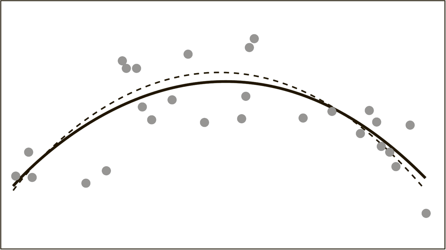 Чтобы понять, как это работает, давайте использовать допущение, которого в реальной жизни не бывает почти никогда. Мы будем точно знать, как должны выглядеть реальные данные. На графике на рис. 5.4 изображена гладкая параболическая кривая с максимумом посередине. Такой кривой можно описывать любые интересные для нас данные из реального мира. Например, как мы уже видели в главе 3, именно такая кривая довольно четко описывает изменение результативности бейсболистов с увеличением возраста, поскольку они значительно более результативны в середине своей карьеры, чем в конце или начале.