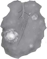 Основным его симптомом является загнивание и отделение листьев от кочерыг. Пораженные ткани становятся водянистыми, приобретают светло-бурую окраску. При ближайшем рассмотрении на листьях можно заметить беловатый налет – грибницу. Через некоторое время пятна начинают темнеть, а грибной налет становится бурым. Рядом с центральной жилкой листа начинают формироваться мелкие плоские черные или темно-серые склероции.