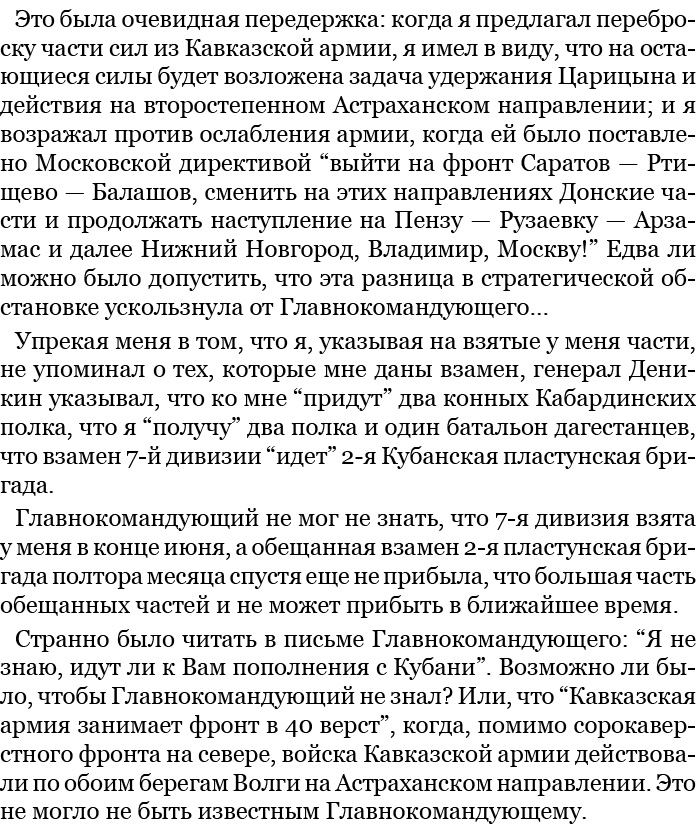 Это была очевидная передержка: когда я предлагал переброску части сил из Кавказской армии, я имел в виду, что на остающиеся силы будет возложена задача удержания Царицына и действия на второстепенном Астраханском направлении; и я возражал против ослабления армии, когда ей было поставлено Московской директивой “выйти на фронт Саратов – Ртищево – Балашов, сменить на этих направлениях Донские части и продолжать наступление на Пензу – Рузаевку – Арзамас и далее Нижний Новгород, Владимир, Москву!” Едва ли можно было допустить, что эта разница в стратегической обстановке ускользнула от Главнокомандующего… Упрекая меня в том, что я, указывая на взятые у меня части, не упоминал о тех, которые мне даны взамен, генерал Деникин указывал, что ко мне “придут” два конных Кабардинских полка, что я “получу” два полка и один батальон дагестанцев, что взамен 7-й дивизии “идет” 2-я Кубанская пластунская бригада. Главнокомандующий не мог не знать, что 7-я дивизия взята у меня в конце июня, а обещанная взамен 2-я пластунская бригада полтора месяца спустя еще не прибыла, что большая часть обещанных частей и не может прибыть в ближайшее время. Странно было читать в письме Главнокомандующего: “Я не знаю, идут ли к Вам пополнения с Кубани”. Возможно ли было, чтобы Главнокомандующий не знал? Или, что “Кавказская армия занимает фронт в 40 верст”, когда, помимо сорокаверстного фронта на севере, войска Кавказской армии действовали по обоим берегам Волги на Астраханском направлении. Это не могло не быть известным Главнокомандующему.