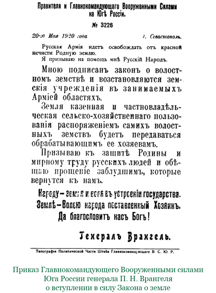 Но чтобы крестьянство знало, что несет ему освобождающая его от большевистского бесправия Русская армия, приказ о земле и земских учреждениях должен был быть не только разработан и объявлен немедленно, но и введен в силу на деле. Необходимо было наглядно показать отношение к земельному вопросу белого движения и твердые намерения национальной власти.