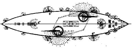 Выше пояса на главной (батарейной) палубе устанавливался бронированный каземат из гарвеированной стали толщиной 305 мм, имевший форму параллелограмма, одна из диагоналей которого соединяла вертикальные оси вращения орудий главного калибра, а другая – оси Двух 6-дюймовых орудий. Он поднимался до верхней палубы и прикрывал основания дымовой трубы, боевой рубки и двух орудийных башен главного калибра. [2, 6] В этом "Техас" оказался более схож не с британским цитадельным броненосцем "Инфлексибл" (1881 г.), у которого пояс с траверзами образовывал посреди корпуса прямоугольную цитадель с двумя диагонально стоявшими башнями), а с итальянским кораблями "Италия" и "Лепанто" (18781883 гг.), вместо пояса имевших лишь броневую палубу и в верхней части корпуса диагональный броневой бруствер для защиты двух барбетов.