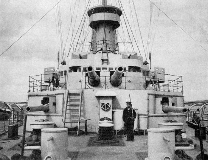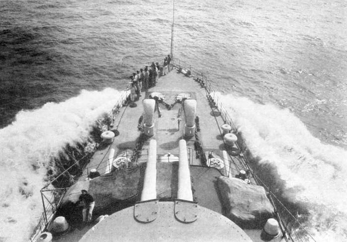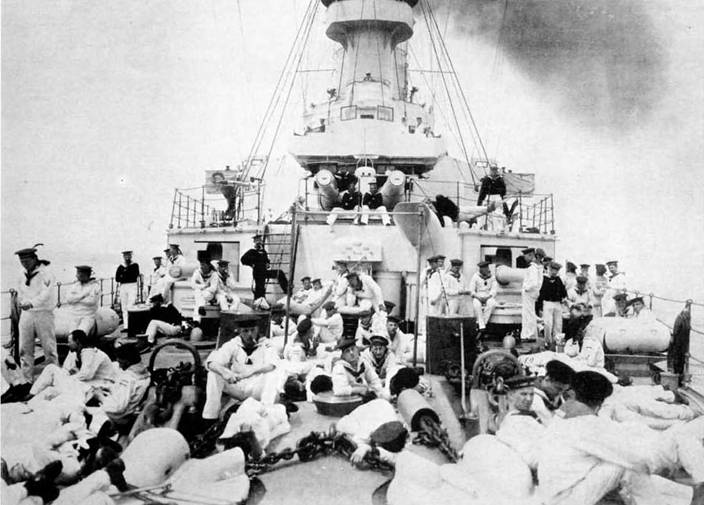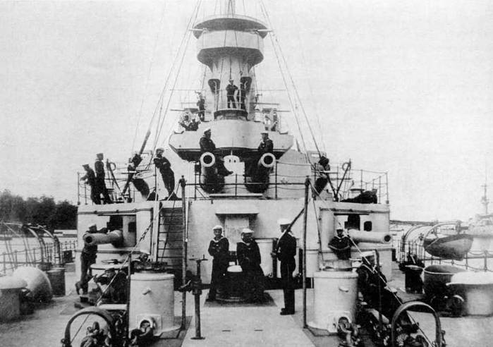 На баке броненосца “Кайзер Вильгельм II” (вверху) “Кайзер Вильгельм II” на рейде