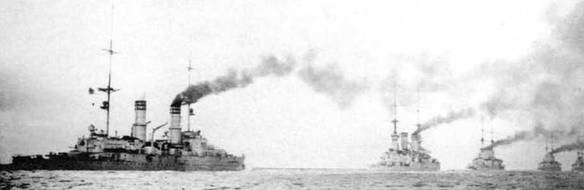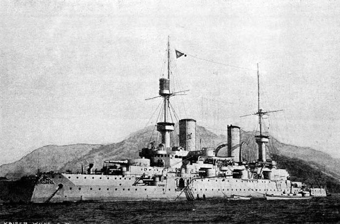 Броненосцы “Кайзер Карл дер Гроссе” на ходовых испытаниях (вверху) и “Кайзер Вильгельм II”