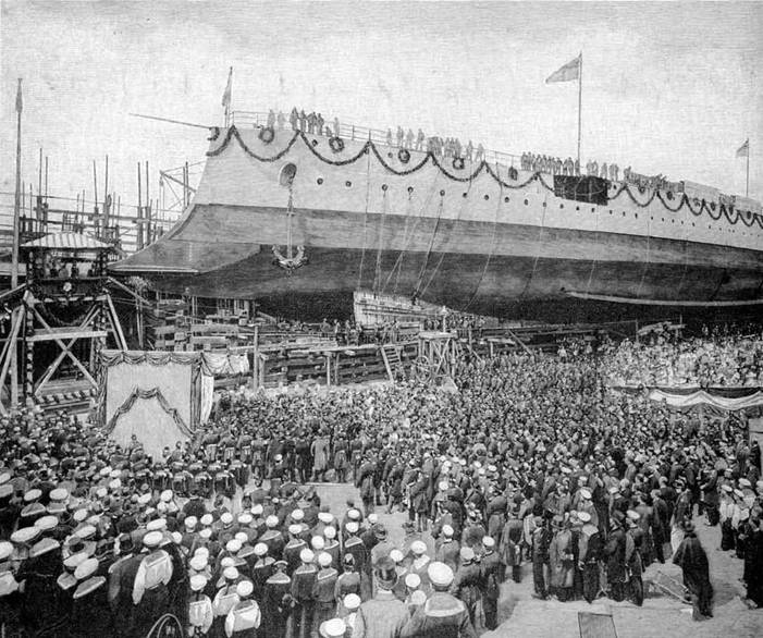 Броненосец "Кайзер Вильгельм дер Гроссе” во время спуска (два фото вверху) и на якорной стоянке (два нижних)