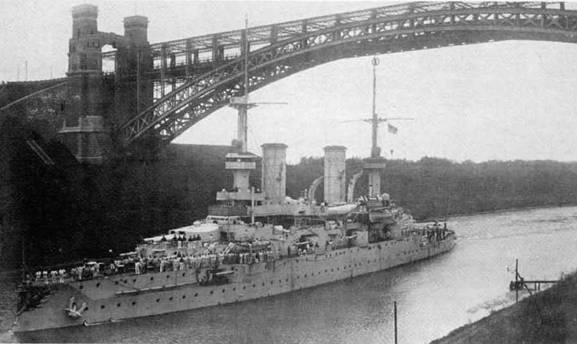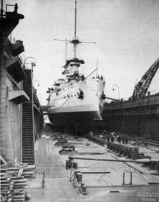 Броненосцы “Кайзер Вильгельм II” в Кильском канале (вверху) и “Кайзер Карл дер Гроссе” в доке.