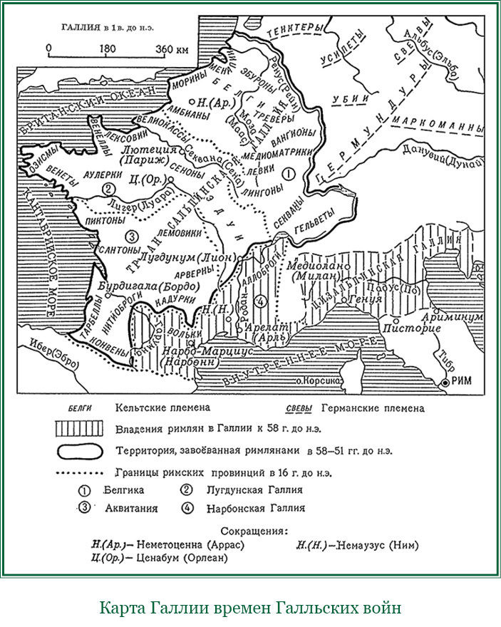 По земле эдуев и секванов протекает и впадает в Родан река Арар. Ее течение поразительно медленно, так что невозможно разглядеть, в каком направлении она течет. Гельветы переправлялись через нее на плотах и связанных попарно челноках. Как только Цезарь узнал от разведчиков, что гельветы перевели через эту реку уже три четверти своих сил, а около одной четверти осталось по сю сторону Арара, он выступил из лагеря в третью стражу с тремя легионами и нагнал ту часть, которая еще не перешла через реку. Так как гельветы не были готовы к бою и не ожидали нападения, то он многих из них положил на месте, остальные бросились бежать и укрылись в ближайших лесах. Этот паг [10] назывался Тигуринским (надо сказать, что весь народ гельветский делится на четыре пага). Это и есть единственный паг, который некогда на памяти отцов наших выступил из своей земли, убил консула Л. Кассия и его армию провел под ярмо [11] . Таким образом, произошло ли это случайно или промыслом бессмертных богов, во всяком случае та часть гельветского племени, которая когда-то нанесла римскому народу крупные поражения, первая и поплатилась. Этим Цезарь отомстил не только за Римское государство, но и за себя лично, так как в упомянутом сражении тигуринцы убили вместе с Кассием его легата Л. Писона, деда Цезарева тестя.