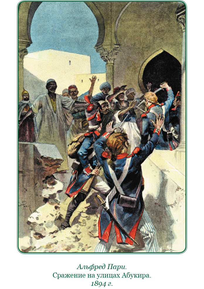 Болезни опустошали их ряды не меньше, чем неприятельские пули. Но едва они дотащились до Каира, как снова пришлось выступить против врага, вдвое превышавшего их силы. Произошла беспримерная битва на мысе Абукир. Французы дрались с мужеством отчаяния, так как для них тут все было поставлено на карту. И они совершили чудеса. Шесть тысяч турок погибли, частью от пуль, частью же были оттеснены к морю и погибли в его волнах. Четыре тысячи положили оружие, и ни один из них не ушел.