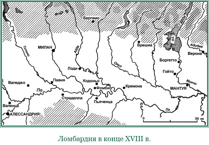 В течение этого времени армия продолжала движение на Олио под начальством Бертье. Главнокомандующий присоединился к ней в Сонсино и 28-го вошел вместе с нею в Брешиа – один из самых больших венецианских городов на материке. Его жители были недовольны господством венецианской знати. Брешиа находится в 11 лье от Кремоны, в 15 – от Мантуи, в 38 – от Венеции, в 24 – от Триента, в 40 – от Милана. Он был покорен Венецианской республикой в 1426 году. В городе Брешиа 50 000 жителей. Во всей провинции насчитывалось 500 000 человек, обитающих частью в горах, частью на богатых равнинах.