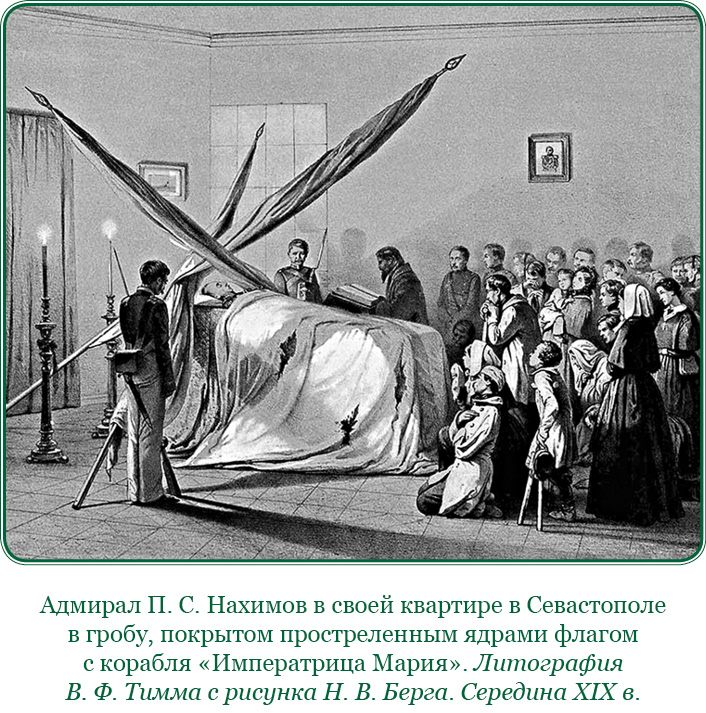 …Я писал вам в прошлом письме о смерти П. С. Нахимова, а теперь скажу, как его хоронили. Он умер на Северной стороне, в беспамятстве, и его в тот же день перевезли в город на квартиру. Когда тело везли мимо флота, то он приспускал свои флаги до половины; этим у нас отдается честь покойнику. Пока он лежал на квартире, то над его телом читали постоянно монахи в полном облачении, по собственному их желанию. В параде участвовали сводный флотский батальон, один армейский при шести полевых орудиях.
