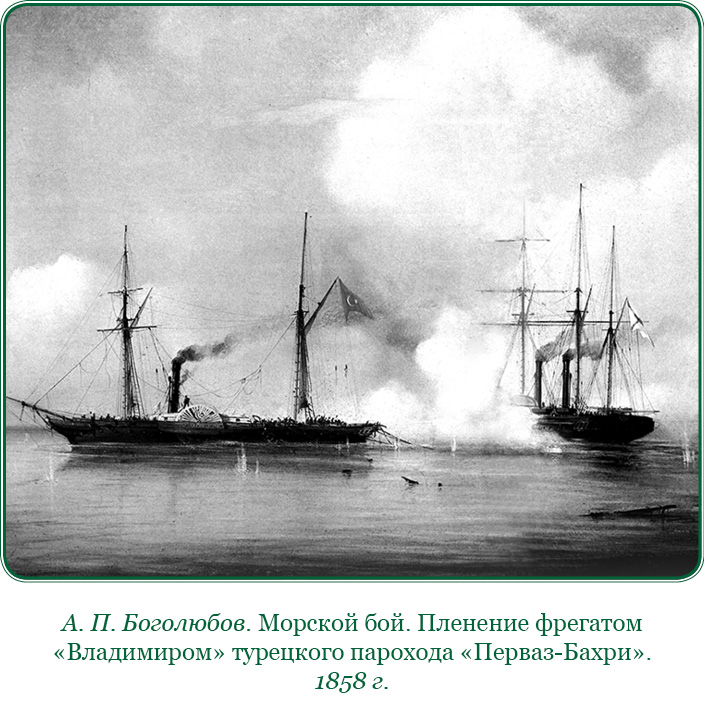 25 октября после нескольких бурных дней установилась хорошая погода. В 8 часов утра эскадра находилась в 11 милях от мыса Керемпе к NО; к полудню мы подошли почти к самому берегу и потом по сигналу стали спускаться на WSW. Через несколько времени заметили под самым берегом пароходный дым, медленно приближавшийся к эскадре. Видно было, что пароход был турецкий: он буксировал другое судно и хотел проскочить мимо эскадры, не поднимая флага.