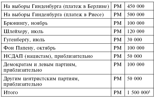 В доказательство он представил подробный перечень субсидий в пользу партий в течение критического 1932 года. Вот эта таблица: