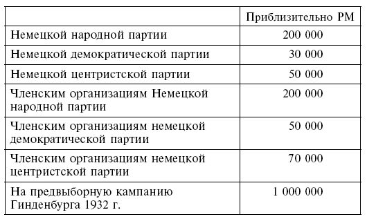 Какой бы ни была роль «ИГ Фарбен» после 1933 года, судя по изученным мной документам, можно считать доказанным, что концерн не помогал Гитлеру до его прихода к власти. Посредником, через которого средства из этого фонда поступали на политическую поддержку нацизма в конце 20-х и в начале 30-х годов, был В.Ф. Калле, глава «Калле и Ко» из Висбадена, дочерней компании «ИГ Фарбен». Калле был депутатом и рейхстага и Прусского ландтага и председателем президиума немецкой народной партии. Вот перечень ежегодных взносов «ИГ Фарбен» политическим партиям через Калле:
