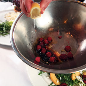 Половину ягод измельчить в блендере с добавлением сахара и апельсинового сока, оставшиеся ягоды нарезать кубиками.