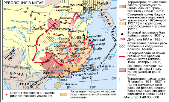 Движение за объединение Китая набирало силу. В мае 1925 г. в Шанхае демонстрация националистически настроенных студентов двинулась к закрытому кварталу, в котором размещались иностранные представительства. Охранявшая квартал британская полиция расценила это как угрозу безопасности дипломатов и открыла огонь по демонстрантам. Гибель людей возмутила весь Китай, началась революция, направленная на национальное объединение страны, против империализма, милитаристов и старого чиновничества. Страну охватили забастовки и митинги. Во главе движения встала партия Гоминьдан, которая выдвинула лозунг объединения Китая. Но в это время в самом Гоминьдане обострились противоречия между коммунистами и их противниками. Главнокомандующим HP А стал близкий соратник Сунь Ятсена генерал Чан Кайши. Он выступал за объединение страны, но был противником предлагавшихся коммунистами антикапиталистических мер и передела земли.