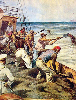 Рабочие выбрасывают кофе в океан, чтобы предотвратить падение цен. Бразилия. 1932 г.
