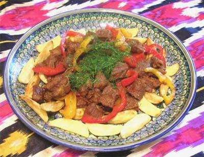 На широкое плоское блюдо («табак») выкладываем сначала картофель, обжаренный во фритюре, равномерно распределив его по всей плоскости, а сверху заливаем тушеным мясом с соусом и обжаренными овощами. Заключительным аккордом является зелень. Обильно посыпаем в центр блюда мелко порубленный укроп и выносим наше блюдо на всеобщее обозрение.