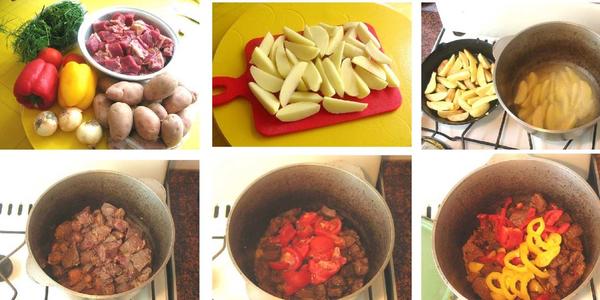 Наконец, переходим к заключительной стадии. Очищаем от плодоножки болгарский перец (лучше разных цветов), промываем его и режем крупно полукольцами. Подготовив его таким образом, закидываем его в казан и осторожно перемешиваем. Жарим еще десять минут, после чего, полностью выключаем плиту. Кабоб готов.