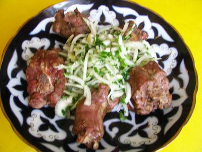 На плиту ставим каскан («мантышницу»), то есть, пароварку и, пока вода закипает, промываем тщательно куски, после чего, хорошенько перетираем их солью, черным молотым перцем и зирой. Оставляем их на некоторое время (30 мин.) в миске, давая возможность замариноваться.