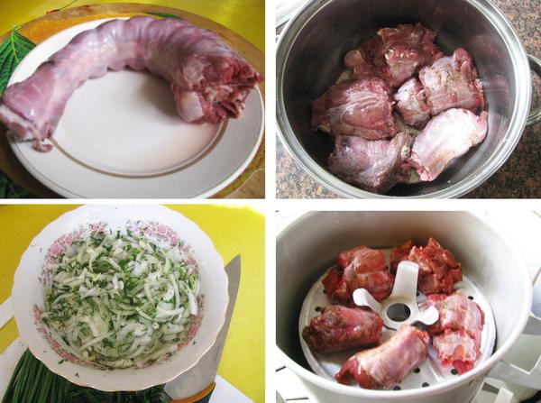 Как только вода в каскане закипит, укладываем равномерно куски хвостов на ярусы-листы и, опустив их в пароварку, оставляем вариться на час с небольшим.