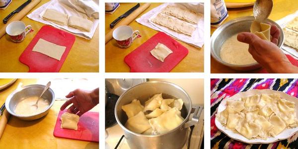 Ставим на плиту казан или алюминиевую кастрюлю, заполняем на три четверти водой и, пока вода закипает, приступаем к раскатыванию теста. Чтобы не повторяться, предлагаю посмотреть в рецепте про «манты». Вся процедура протекает «один к одному», за исключением последнего момента: там мы разрезаем на «квадратики», а здесь следует разрезать на «прямоугольники», длина которых вдвое больше ширины. Теперь подготавливаем небольшой поднос, который устилаем чистой льняной или вафельной салфеткой, складываем на неё наши «прямоугольники» небольшими стопками (чтобы не слиплись между собой) и сверху накрываем ещё одной салфеткой для того, чтобы заготовки не обветрились.