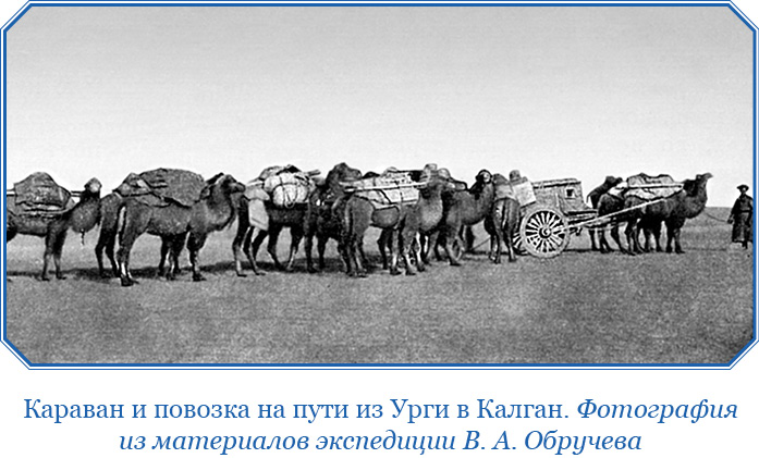 Мы выехали из Урги в половине октября, когда было еще довольно тепло, морозы по ночам не превышали нескольких градусов. Но с начала ноября стало очень холодно, даже днем, и 15–20° мороза не были редкостью при сильных ветрах с севера. Тогда я и оценил коробок, в котором согревался днем после нескольких часов верховой езды и хорошо спал ночью. С нами шло не шесть нанятых мною верблюдов, а десятка два, так как мои монголы, доставившие в Ургу чай, шли теперь порожняком обратно в Калган за новым грузом и подрядились везти меня дешево. Чтобы не утомлять верблюдов, они меняли и вьючных, и в экипаже.