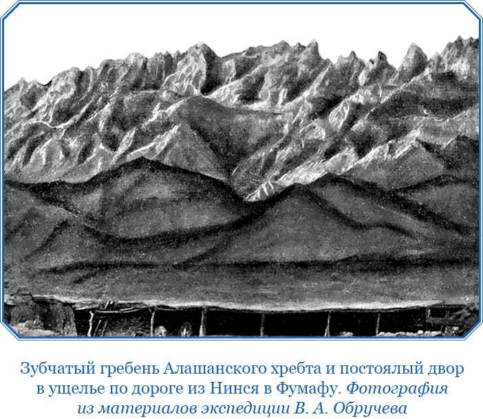 Мы переночевали в маленьком поселке среди пустыни, существующем, очевидно, только на счет проезжих по этой дороге, ведущей в г. Фумафу, столицу Алашанского князя; возле поселка полей не было. На следующий день продолжали путь и вскоре поднялись на холмы предгорий, к устью ущелья; здесь, несмотря на каменистую почву, усыпанную валунами, много площадок было расчищено под пашни, обсаженные деревьями, а в устье ущелья оказалось и селение, отвоевавшее у пустыни свои поля благодаря возможности орошения их водой небольшой речки, текущей с гор. Валуны пашен были тщательно сложены в стенки, ограждающие участки полей. Подобные же маленькие селения китайцев видны были и в устьях соседних ущелий.