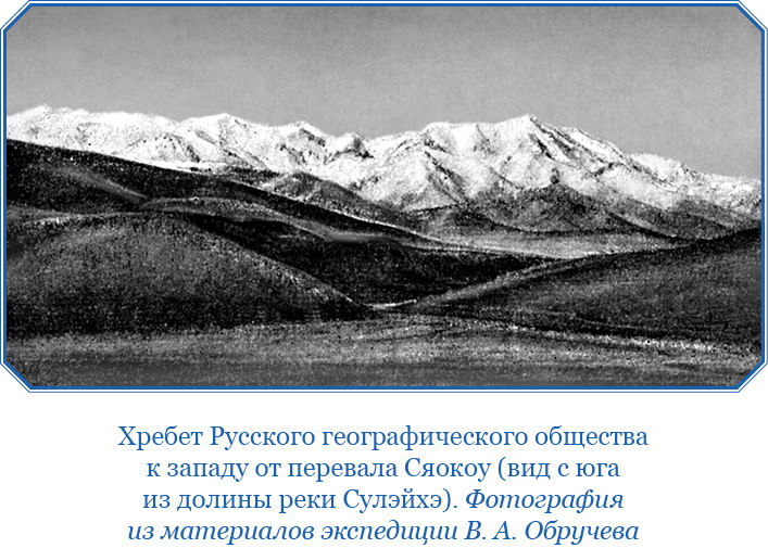 Через два дня мы пересекли долину р. Толайхэ, два раза ночевали на северном склоне следующего хребта, а на третий день поднялись на перевал Дакоу, в 4340 м абсолютной высоты, и спустились к берегу р. Сулэйхэ, текущей в следующей продольной долине. Эта река была нам уже знакома, мы прошли через нее в прошлом году по мосту далеко на западе, где она, прорвавшись уже через два хребта, подступает к понизившемуся хр. Рихтгофена. За долиной этой реки, сравнительно неширокой, горизонт был закрыт четвертой цепью Наньшаня, еще гуще покрытой снегом: целый ряд куполообразных вершин, вполне скрытых под толстыми снегами, поднимался над очень пологими склонами. Но немного восточнее хребет резко понижался, снега на нем исчезали, и широкий плоский увал тянулся на месте хребта на протяжении более 25 верст. Только еще восточнее на горизонте снова резко поднималась густо покрытая снегами огромная группа Шаголин-Намдзил, которой, вероятно, начиналась следующая высокая часть хребта, уходившая на восток.
