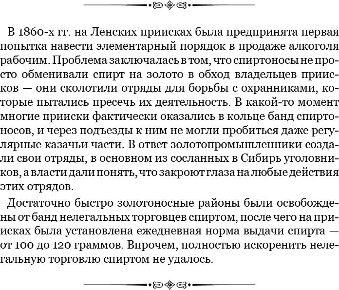 Еще хуже, если этот мелкий золотопромышленник, присоседившийся к приискам крупной компании, покупал похищенное золото не на деньги, а на спирт, который он мог разбавлять водой и подкреплять настоем перца. На этом поприще он конкурировал со спиртоносами, промышленниками, которые приносили спирт, купленный в городах и в казенных лавках, в сосудах на своей спине и, расположившись в тайге вблизи какого-либо прииска, продавали спирт рабочим в обмен на похищенное золото. Но спиртоносов охрана приисков могла арестовывать, тогда как золотопромышленника, продававшего спирт, трудно был уличить, потому что некоторое количество спирта для своих рабочих он имел право держать.