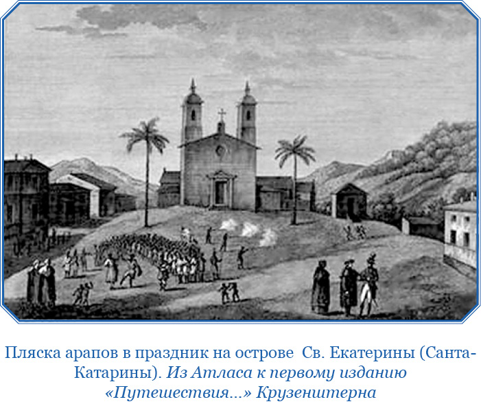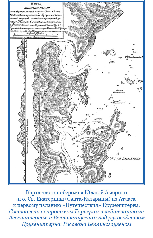 Остров сей, отделяемый от матерой земли проливом шириною в 200 саженей, лежит на NNO и SSW; длина оного 25 миль, ширина от трех до четырех миль. Первые об острове сем известия и первую карту, изданную с довольною точностью, доставил нам, по мнению моему, Фрезье. Сравнение оной с нашею покажет маловажное различие. После Фрезье сообщил свету некоторые известия о сем острове лорд Ансон. Лозье де Буве коснулся сего острова в 1738 г., а несчастный Лаперуз в 1785 г. В 18 лет, протекших после лаперузовой здесь бытности, не произошло, кажется, никакой существенной перемены с островом Св. Екатерины. Пространный рейд как тогда, так и ныне защищается только тремя укреплениями, из коих Понта Гросса находится на западной стороне острова; Санта-Крус на малом острове Атомирисе и третье, о девяти пушках, на острове Ратонесе; но из сих девяти пушек были только три в надлежащем состоянии. Крепость Санта-Крус есть важнейшая.