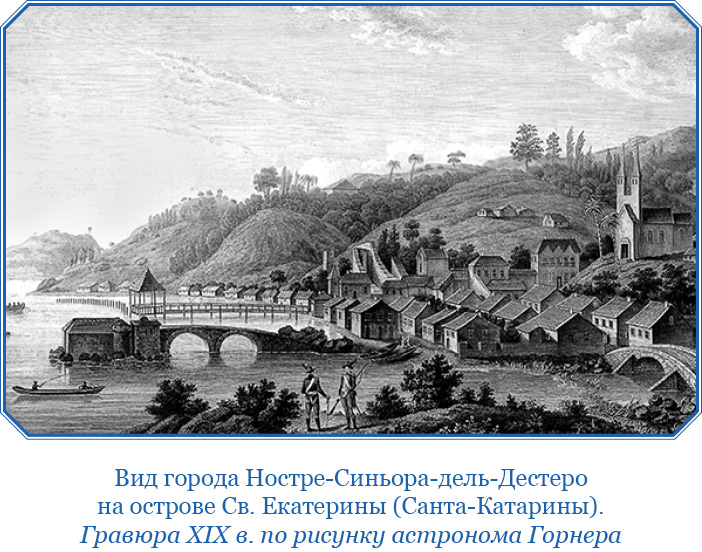 Прием на острове Св. Екатерины. – Установление обсерватории на острове Атомирисе. – Усмотрение повреждения мачт на корабле «Неве». – Непредвидимое промедление у сего острова. – Примечание об укреплении рейда, о городе Ностра-Сенеро-дель-Дестеро, о военнослужащих, о настоящем состоянии сего владения; о торговле и произведениях оного. – Плоды и произрастания, нужные для мореплавателей и цена оным. – Английский капер. – Морские и астрономические наблюдения.