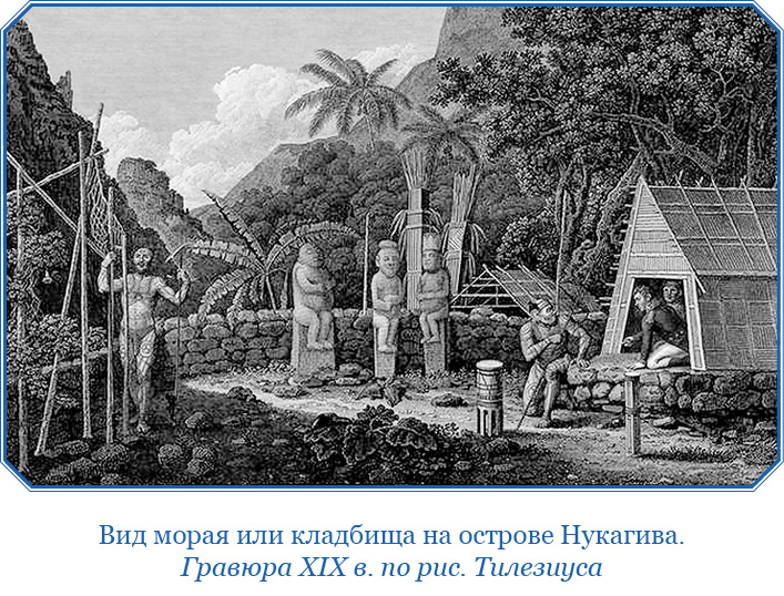 Итак, подозрение мое на француза оказалось основательным. Одарив короля и всю фамилию, просил я его не нарушать согласия, но обходиться с нами дружественно, представляя, что я без вынуждения конечно не употреблю ни против кого насилия, а тем менее еще против самого его, почитая своим приятелем. Отдохнув и освежась соком кокосовых орехов, вознамерились мы итти с путеводителем Робертсом к мораю или кладбищу. Но прежде выхода нашего из королевского дома показали нам его внучку, которая, как и все дети и внучата королевской фамилии, признается за Етау или существо божеское. Она содержится в особенном доме, в который имеют вход только мать, бабка и ближайшие родственники. Для всех прочих дом сей – табу.