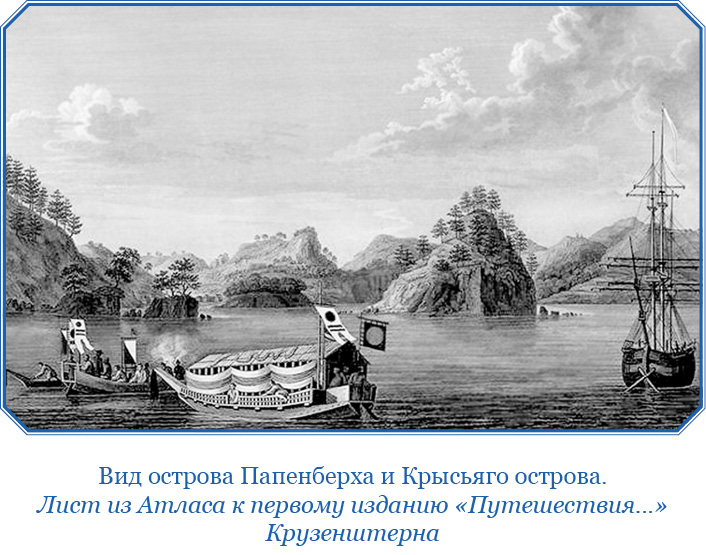 По сравнении такой копии с подлинником прислал губернатор донесение на корабль с двумя своими секретарями, чтобы оное в глазах их было запечатано. При отходе голландских кораблей приказали нам не посылать к оным своего гребного судна ни под каким видом. Когда я во время прохода мимо нас голландских кораблей спрашивал начальников оных об их здоровье и желал им счастливого плавания, тогда ответствовали они мне одним маханием рупора. Начальник голландской фактории извинялся в письме своем к нашему посланнику, что управляющим кораблями запрещено было наистрожайше не подавать ответа на вопросы наши ни малейшим голосом. Нельзя найти равносильных слов к выражению такого варварского уничтожительного поступка.