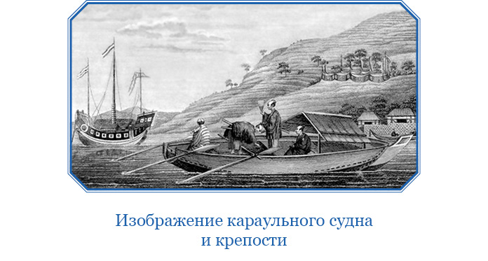 На другой день оставался я на корабле, потому что в первый день, во время моего отсутствия, приезжали к нам многие японцы и обещались быть опять на другой день. В девять часов следующего утра действительно они прибыли со своим офицером, их начальником, на большой лодке, гребцами на коей были здешние жители. Офицер представил нам, что он крайне устрашен прибытием нашим и просил нас убедительно удалиться немедленно, поелику уверял он, как скоро узнают о том в Матсумае, куда он неупустительно послать должен донесение, то прибудет вдруг многочисленный флот, от которого мы не возможем уже ожидать ни малейшей пощады. Для придания угрозам своим более силы повторял он многократно слово бум-бум и, надувая обе щеки, пыхал чрезвычайно; сим уповательно хотел он нам вразумить, что по прибытии флота, поступлено будет с нами самым жестоким образом. Его угрозы и страшные телодвижения были столь странны, что с трудностью удержаться можно было от смеха.