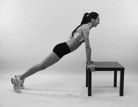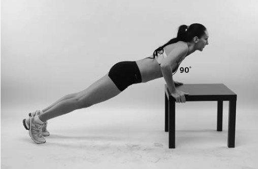 Руки прямые, расположены на опоре на ширине плеч, пальцы смотрят вперед. Если поверхность опоры скользкая, то допускается фиксация за края опоры (как на фото). Мышцы живота и ягодиц напряжены, для избегания прогиба в пояснице. Спина прямая, голова на одной линии с позвоночником.
