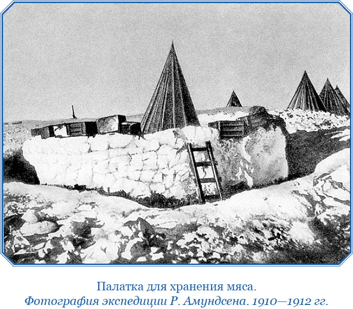 Один день собаки получали тюленье мясо и сало, другой – сушеную рыбу. Как правило, и то, и другое ели без капризов, но все же мясо им нравилось больше. Почти всю зиму у нас лежали на снегу тюленьи туши. Понятно, они были предметом усиленного интереса. Эта площадка стала чем-то вроде Фрамхеймского базара. И не всегда здесь бывало мирно. Клиентов много, спрос велик, отсюда и оживление, частенько царившее на базаре. Основной запас тюленины хранился в «мясной палатке». В ней лежало штабелями около 100 разделанных туш.
