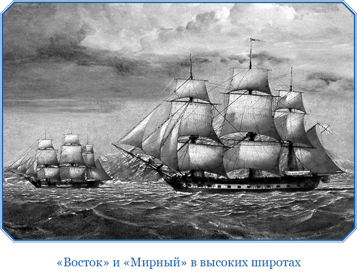 Матрос Южиков, стоявший в сие время на грот-брам-салинге, сказывал, что вершина льда была многим выше клотика, а обращенная к нам сторона, совершенно перпендикулярная, представлялась в виде величайшего щита; к счастью, мы имели тогда хода более пяти миль в час и сим ходом прошли длину острова около двухсот сажен. Вскоре после сего прошли такой же остров и видели, как великие оного части с большим треском и шумом сваливались в море.