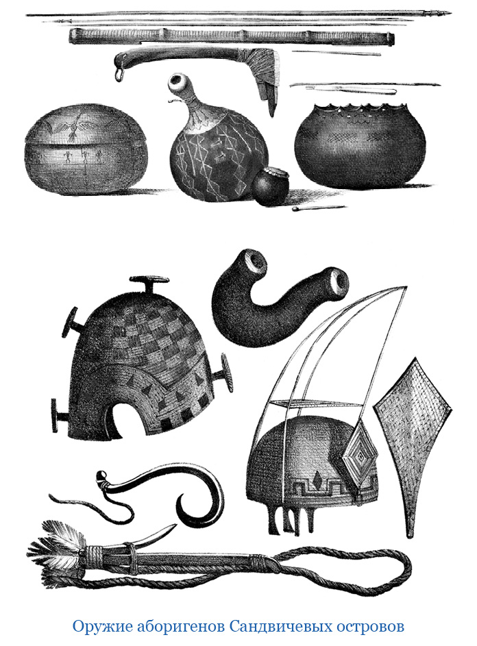 На каждой было 3 или 4 проворных островитянина; каждый имел по аркану из сплетенных травяных веревок, пику, небольшую булаву. По всем сим признакам нам казалось, что островитяне выехали в намерении напасть на нас с разных сторон и, ежели возможно, овладеть шлюпами. Может быть, не видав никогда европейских судов, по дальности расстояния заключили, что видят лодки, идущие с одного острова на другой для промысла или неприязненных действий, и что можно ими овладеть.