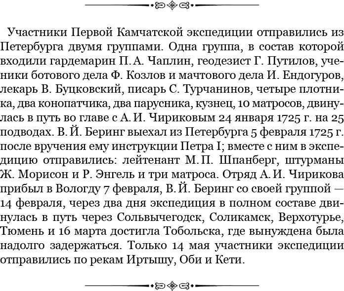 В экспедицию сию назначены были вышеименованные чиновники, из коих часть отправлена была из Санкт-Петербурга, а другая приобщена в Тобольске и Охотске.
