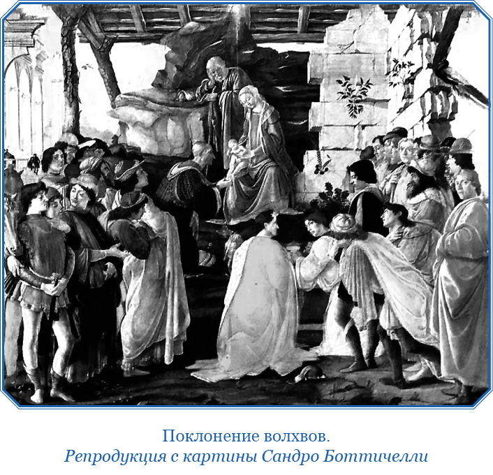 Проехали они немного дней, и захотелось им посмотреть, что дал им младенец; открыли они ящичек и видят, что там камень. Дивились они, что бы это значило. А младенец дал им камень в знамение того, чтобы вера их, которую они восприяли, была тверда, как камень. Как увидели три царя, что младенец принял все приношения, тут все и сказали, что он Бог, царь земной и врач. А младенец знал, что все трое одной веры, и дал он им камень в знамение того, чтобы были тверды и постоянны в своей вере.