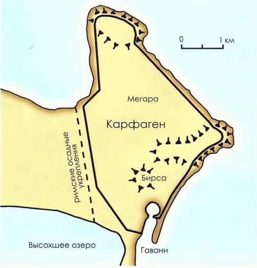 Сципион восстановил пошатнувшийся боевой дух своих солдат, устроив рейд на Мегару — один из районов Карфагена. Затем, обратившись к опыту прежних поколений, он решил полностью изолировать город и начал блокаду. Эта стратегия не использовалась ни в одной из знаменитых осад предшествующих лет. Но, будучи приемным внуком великого Сципиона Африканского, Сципион Эмилиан должен был слышать историю Оронгия, осажденного братом Сципиона Африканского в 207 году до н.э. Там город был обнесен двойным рвом и валом, после чего со всех сторон начался приступ (Ливий 28.3.2–16). Нечто подобное Сципион готовил и для Карфагена.