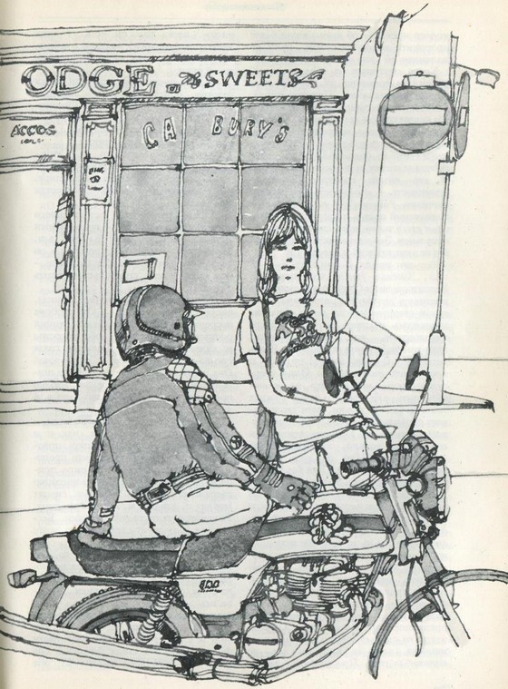 Наверно, это неприятно, когда тебя называют Бородатым только за то, что у тебя выпирает подбородок. Прозвища попадались ужасные: одного мальчишку звали Придурок Адамс, другого — Мокруха-Коротышка, а одну девчонку — Поцелуйчик. Имя Бородатого Мартина — Клайв, только она никогда не слышала, чтоб его кто-нибудь так называл. Видя, как он стоит со своим шлемом, в этом своем наряде, ей стало жалко его. Наверно, он заранее все это обдумал, стараясь поразить ее своим нарядом и мотоциклом. Зря старался, конечно. На баке его мотоцикла было написано «Ямаха» и была наклеена фигурка девушки в купальнике — видно, сам налепил. Купальник был желтый, и волосы у девушки были тоже желтые и развевались, словно на ветру. Бак мотоцикла был черный.