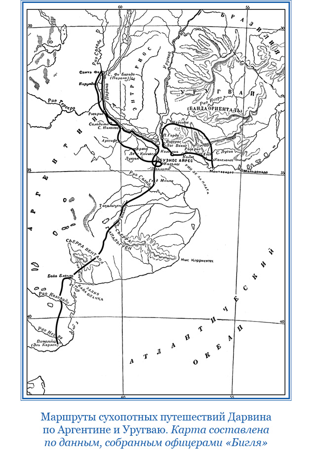 12 и 13 сентября. На этой посте я пробыл два дня в ожидании отряда солдат, который, как любезно послал сообщить мне генерал Росас, должен был в скором времени проехать в Буэнос-Айрес; он советовал мне воспользоваться этим отрядом как охраной. Утром мы поскакали к соседним холмам, чтобы осмотреть местность и познакомиться с ее геологией. После обеда солдаты разделились на две партии, чтобы померяться сноровкой в обращении с боласами. В землю, на расстоянии 35 ярдов одна от другой, воткнули две пики; попасть в них и обвить шарами удавалось только один раз из четырех или пяти.